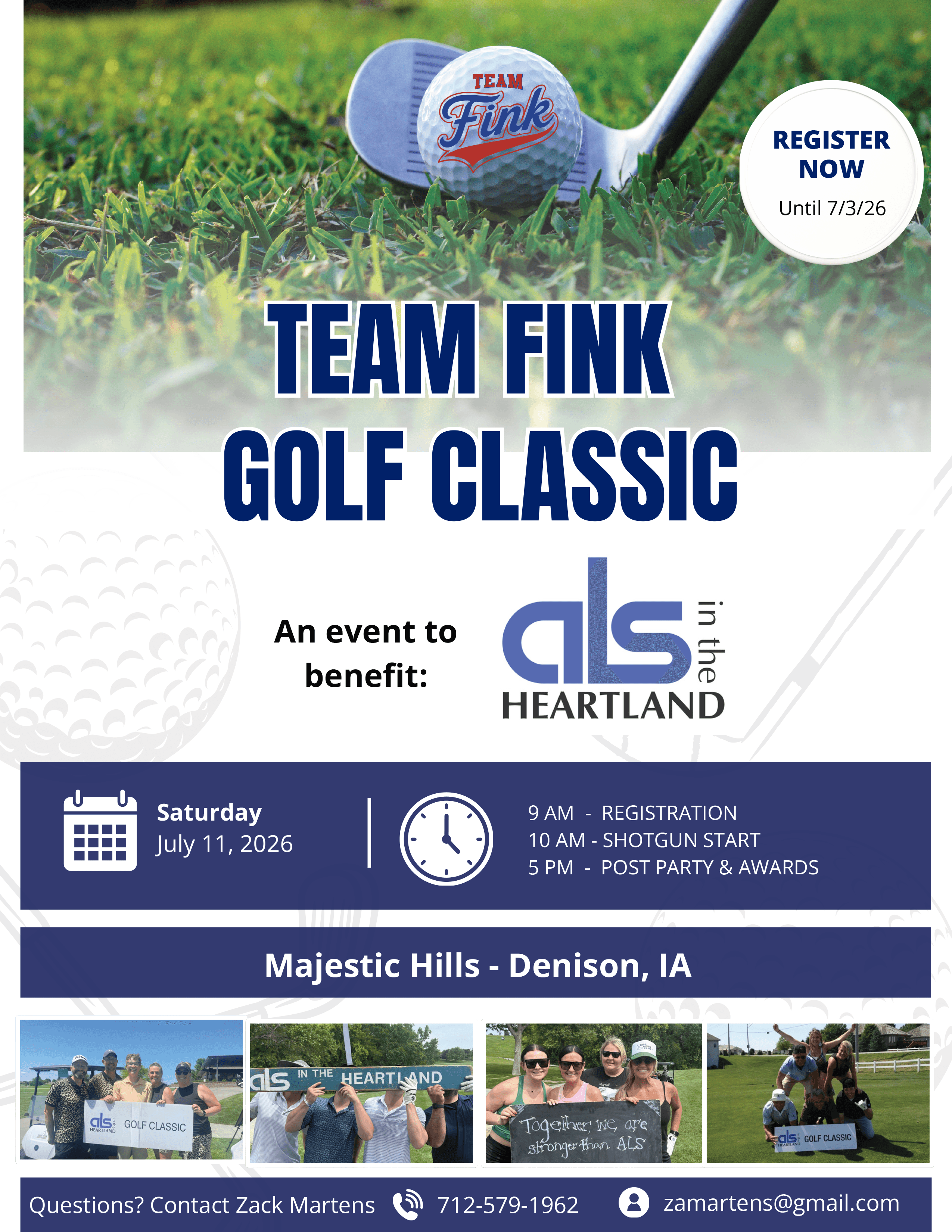 Join us for the Team Fink Golf Classic on Saturday, July 11, 2026 at Majestic Hills in Denison, IA, benefiting ALS in the Heartland. The tournament day includes 9:00 AM registration, a 10:00 AM shotgun start, and a post-tournament party and awards celebration.